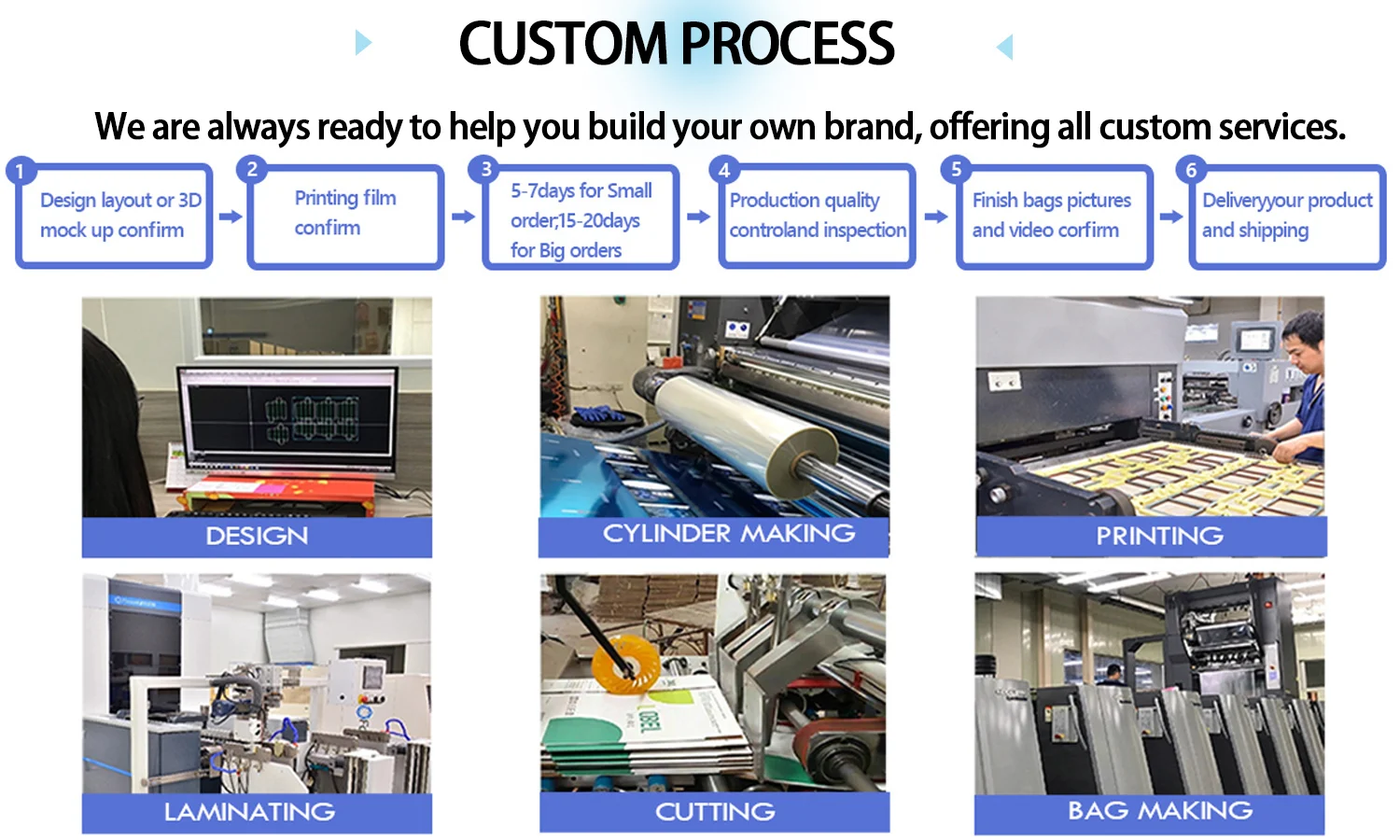 Equipped with the most advanced equipments, including HP indigo200K, 2 ten-color rotograure printing machines, 3 eight-color printing machines, 3 high-speed compound machines, 18 high-speed bag making machines, various quality inspection equipments, and 2 Heidelberg printing 6 colors machines. These equipments enable us to complete 1 million packaging bags and one hundred thousand boxes per day!